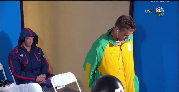 Michael Phelps qualified for the 200m butterfly finals on Monday night. Before his preliminary heat, Phelps was seated behind South African swimmer Chad Le Clos with his earbuds in, getting in the zone. Phelps probably wasn't intentionally staring down Le Clos, but Le Clos was standing right in front of him, and it looked that way on TV.